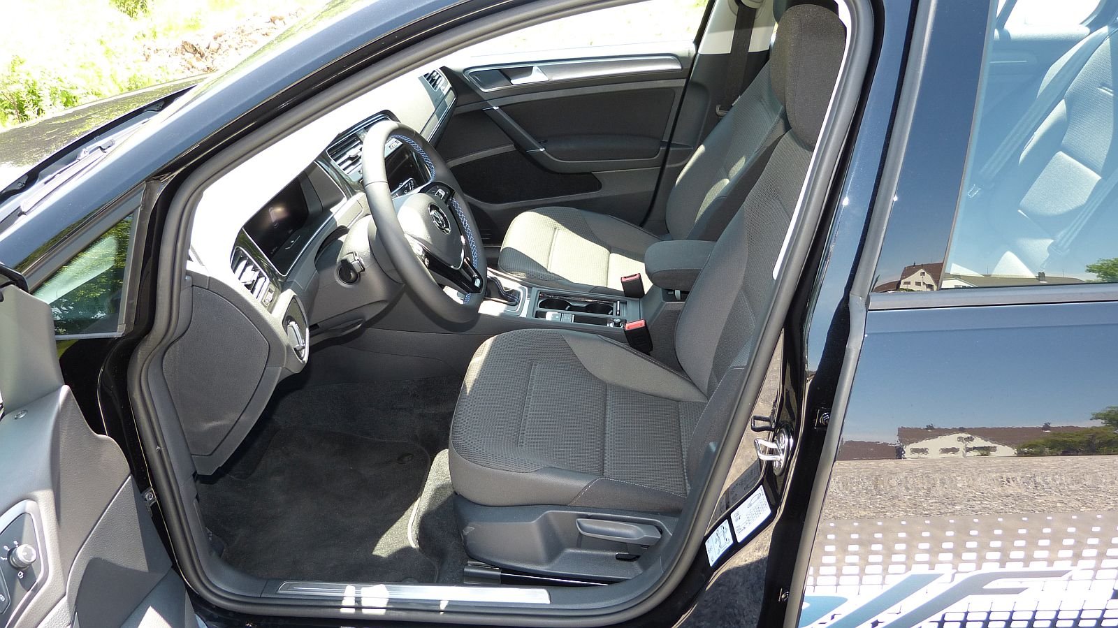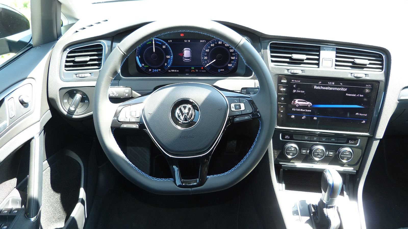 Ein Golf ist ein Golf ist ein Golf. Das gilt natürlich auch für den Innenraum. Dieser kommt gewohnt nüchtern-konservativ daher. Die blauen Ziernähte an Lenkrad und Schalthebel agieren als Pendant zu den äusseren e-spezifischen Akzenten.